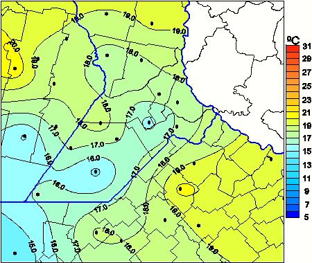 Mapa de temperaturas medias de las las últimas 72 horas.(Desde las 8:00AM hasta las 8:00AM). Se actualiza a las 10:00hs.