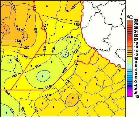 Mapa de temperaturas medias de las las últimas 48 horas.(Desde las 8:00AM hasta las 8:00AM). Se actualiza a las 10:00hs.