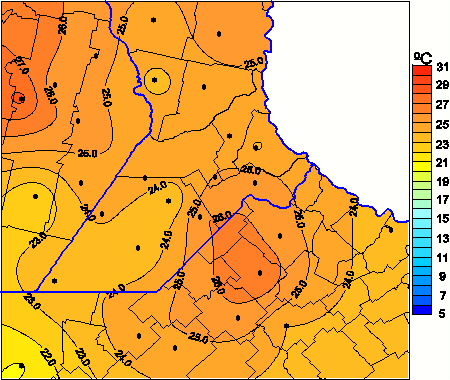 Mapa de temperaturas medias de las las últimas 48 horas.(Desde las 8:00AM hasta las 8:00AM). Se actualiza a las 10:00hs.