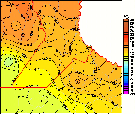 Mapa de temperaturas mínimas de las las últimas 96 horas.(Desde las 8:00AM hasta las 8:00AM). Se actualiza a las 10:00hs.