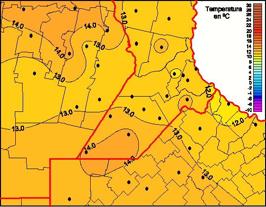 Mapa de temperaturas mínimas de las las últimas 96 horas.(Desde las 8:00AM hasta las 8:00AM). Se actualiza a las 10:00hs.