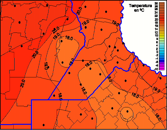 Mapa de temperaturas mínimas de las las últimas 120 horas.(Desde las 8:00AM hasta las 8:00AM). Se actualiza a las 10:00hs.