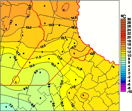 Mapa de temperaturas mínimas de las las últimas 72 horas.