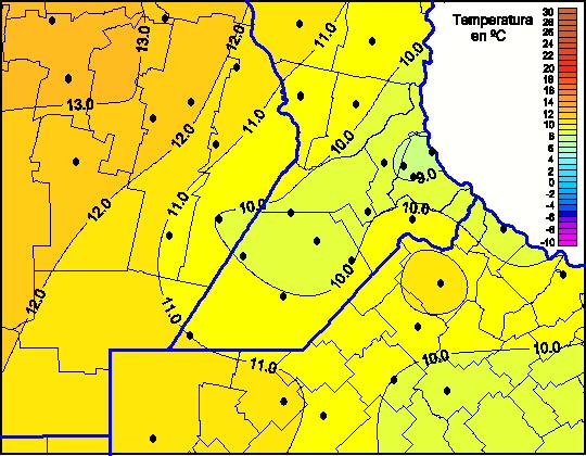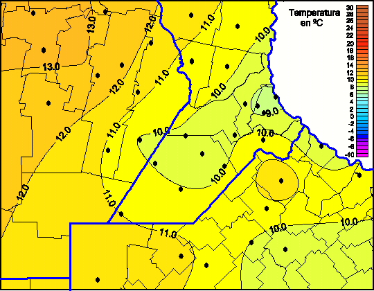 Mapa de temperaturas mínimas de las las últimas 168 horas.(Desde las 8:00AM hasta las 8:00AM). Se actualiza a las 10:00hs.