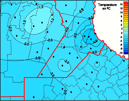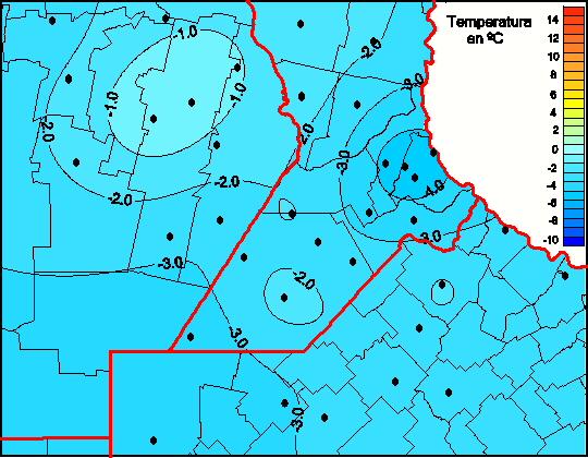 Mapa de temperaturas mínimas de las las últimas 120 horas.(Desde las 8:00AM hasta las 8:00AM). Se actualiza a las 10:00hs.