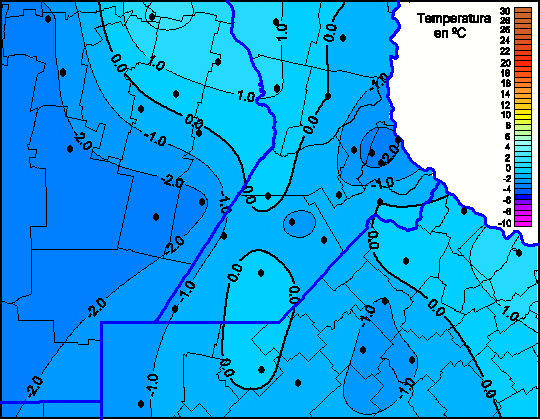 Mapa de temperaturas mínimas de las las últimas 96 horas.(Desde las 8:00AM hasta las 8:00AM). Se actualiza a las 10:00hs.