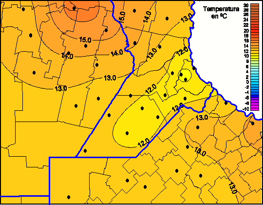 Mapa de temperaturas mínimas de las las últimas 96 horas.(Desde las 8:00AM hasta las 8:00AM). Se actualiza a las 10:00hs.