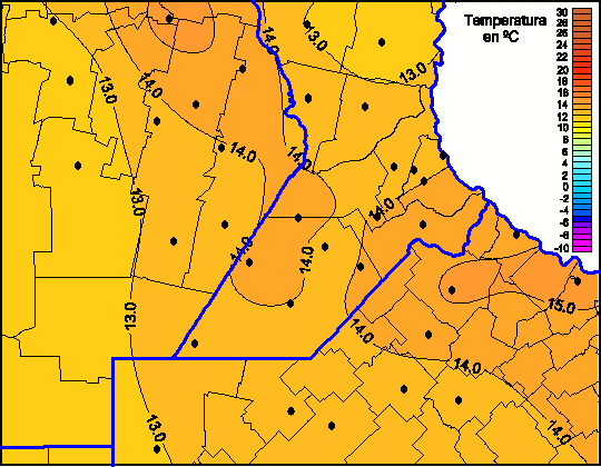 Mapa de temperaturas mínimas de las las últimas 120 horas.(Desde las 8:00AM hasta las 8:00AM). Se actualiza a las 10:00hs.