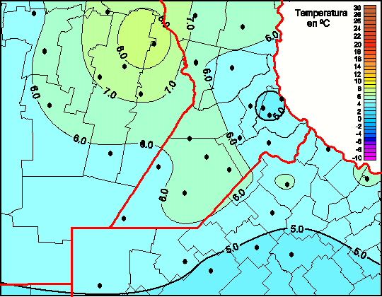 Mapa de temperaturas mínimas de las las últimas 96 horas.(Desde las 8:00AM hasta las 8:00AM). Se actualiza a las 10:00hs.