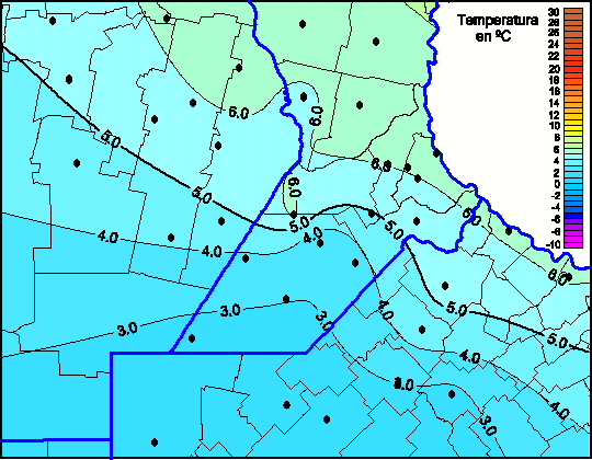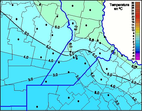 Mapa de temperaturas mínimas de las las últimas 120 horas.(Desde las 8:00AM hasta las 8:00AM). Se actualiza a las 10:00hs.