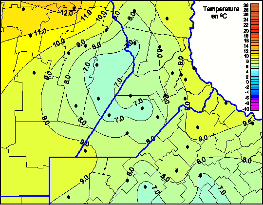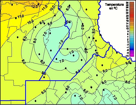 Mapa de temperaturas mínimas de las las últimas 120 horas.(Desde las 8:00AM hasta las 8:00AM). Se actualiza a las 10:00hs.