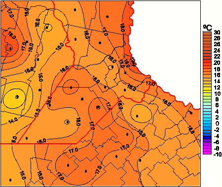 Mapa de temperaturas mínimas de las las últimas 96 horas.(Desde las 8:00AM hasta las 8:00AM). Se actualiza a las 10:00hs.