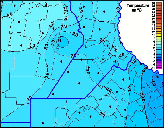 Mapa de temperaturas mínimas de las las últimas 96 horas.(Desde las 8:00AM hasta las 8:00AM). Se actualiza a las 10:00hs.