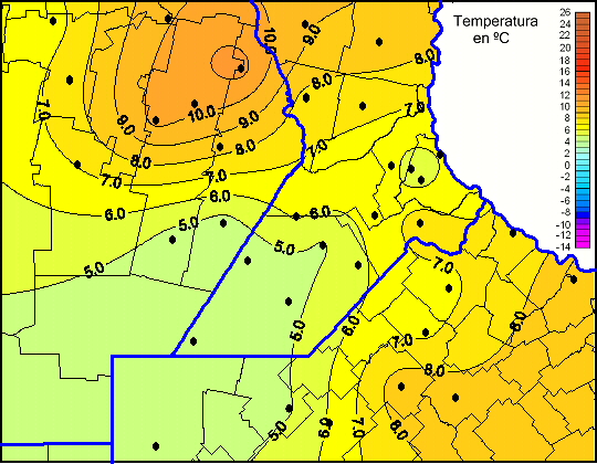Mapa de temperaturas mínimas de las las últimas 96 horas.(Desde las 8:00AM hasta las 8:00AM). Se actualiza a las 10:00hs.
