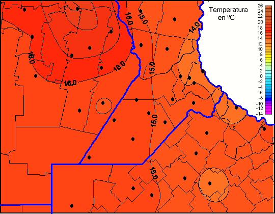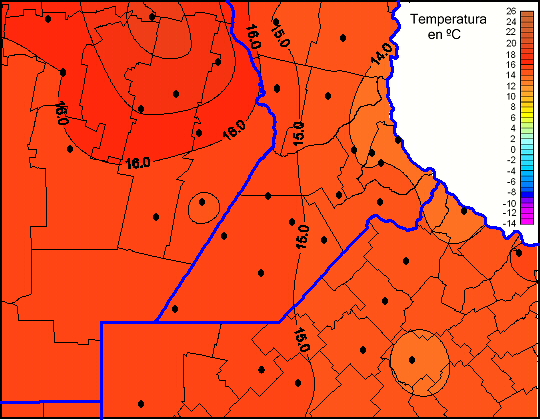 Mapa de temperaturas mínimas de las las últimas 120 horas.(Desde las 8:00AM hasta las 8:00AM). Se actualiza a las 10:00hs.