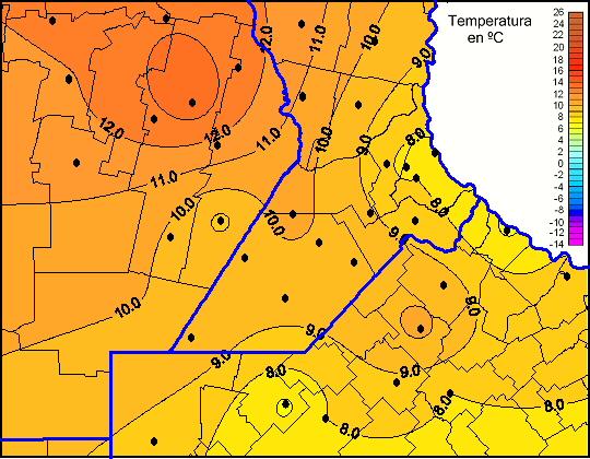 Mapa de temperaturas mínimas de las las últimas 120 horas.(Desde las 8:00AM hasta las 8:00AM). Se actualiza a las 10:00hs.
