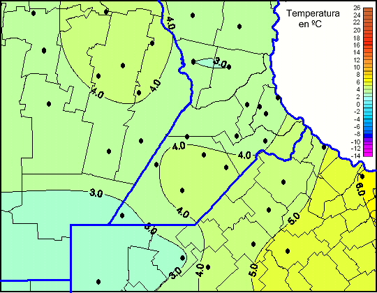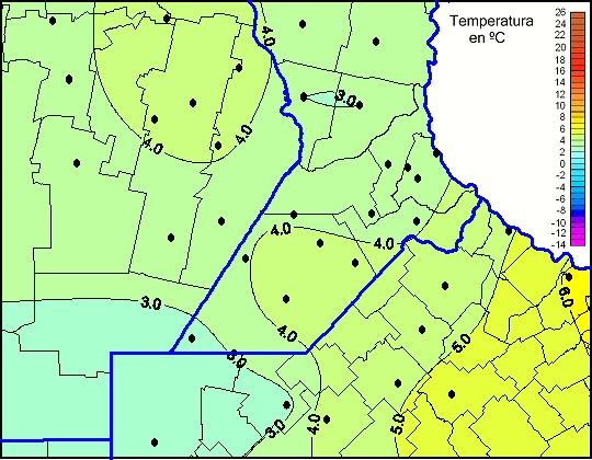 Mapa de temperaturas mínimas de las las últimas 96 horas.(Desde las 8:00AM hasta las 8:00AM). Se actualiza a las 10:00hs.