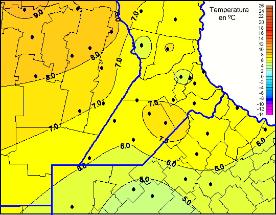Mapa de temperaturas mínimas de las las últimas 96 horas.(Desde las 8:00AM hasta las 8:00AM). Se actualiza a las 10:00hs.