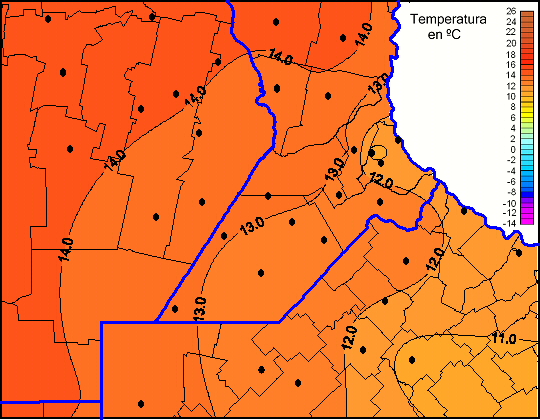 Mapa de temperaturas mínimas de las las últimas 96 horas.(Desde las 8:00AM hasta las 8:00AM). Se actualiza a las 10:00hs.