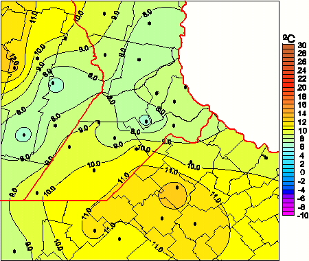 Mapa de temperaturas mínimas de las las últimas 96 horas.(Desde las 8:00AM hasta las 8:00AM). Se actualiza a las 10:00hs.
