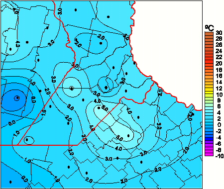 Mapa de temperaturas mínimas de las las últimas 96 horas.(Desde las 8:00AM hasta las 8:00AM). Se actualiza a las 10:00hs.