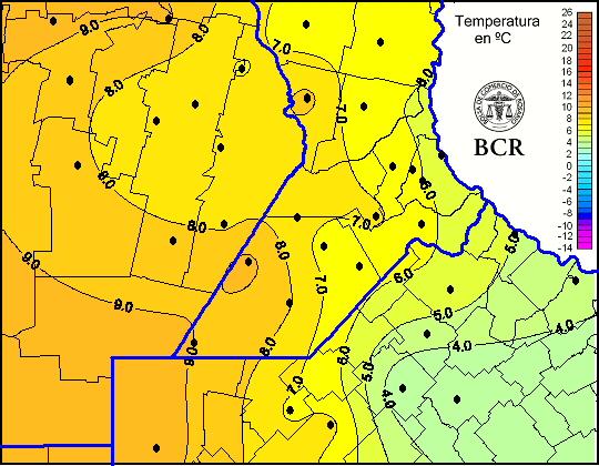 Mapa de temperaturas mínimas de las últimas 24 horas.