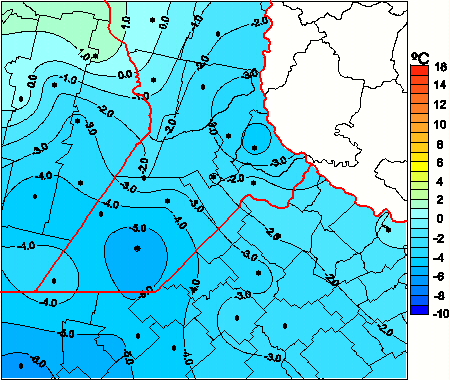 Mapa de temperaturas mínimas de las las últimas 96 horas.(Desde las 8:00AM hasta las 8:00AM). Se actualiza a las 10:00hs.