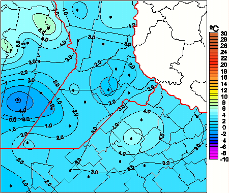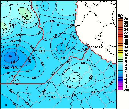 Mapa de temperaturas mínimas de las las últimas 72 horas.
