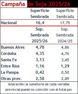 En total, hay implantadas 10,5 M de ha de las 16,4 M de ha intencionadas para este ciclo 2025/26. Con estos valores de siembra, el horizonte productivo nacional es de 47,0 Mt.