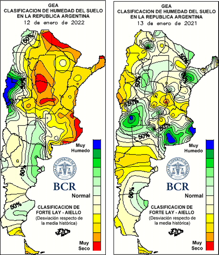Esta vez no ocurrió: en el 2021 si hubo un evento de lluvias del 8 al 12 de enero que le daba un punto de giro a la campaña, evitaba los descuentos y llegaba justo a tiempo para cambiar de rumbo al maíz. Por el contrario, 2022 sigue sin lluvias importantes. Ya van casi 30 días sin milímetros significativos que den auxilio: el maíz sigue sufriendo dos golpes de calor que se han sucedido con apenas una semana de respiro en medio. Temperaturas extremas, baja humedad relativa, días de vientos continuos, una humedad relativa de 10 a 15% y una radiación con valores de watts también extremos son algunas de las variables que se han alineado para poner al maíz de primera contra las cuerdas ya que han predominado en la etapa crítica del cultivo. El resultado de todo esto es que respecto a lo que se esperaba en diciembre, un escenario que con cierta normalidad hacía posible alcanzar 56 MT, la primera estimación maicera para argentina es de 48 MT. El ajuste mensual ha sido muy fuerte: el descuento es de un14%.