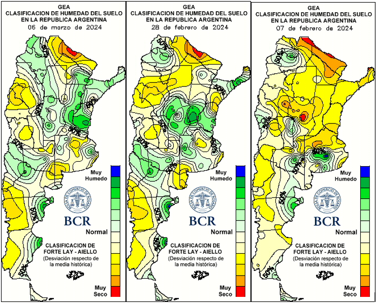 Febrero terminó en gran parte del país con lluvias que superaron las medias mensuales. El cambio llegó tarde: la ola de calor se impuso sobre la condición de la oleaginosa, arrebatando la posibilidad que había de alcanzar una supercosecha de 55 Mt. Las lluvias comenzaron a llegar después del 7 de febrero. Santa Fe, sobre todo el centro, Córdoba y buena parte de Buenos Aires y La Pampa recibieron lluvias que superaron la media de Febrero. Pero hubo excepciones, zonas que quedaron al margen y aún hoy siguen sin recuperarse: el centro este y NE bonaerense por un lado, SO también de Buenos Aires, centro de Córdoba, San Luis y gran parte del área productiva de Chaco y Santiago del Estero.