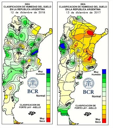 La siembra de soja ya muestra un retraso considerable, con 20 puntos porcentuales atrás de los promedios. Hay zonas que muestran graves atrasos por los excesos hídricos. Por el contrario, las áreas del centro y norte bonaerense necesitaban nuevos aportes. Este atraso, junto a las regulares condiciones que muestran los lotes en la región central, tras las lluvias de noviembre y las bajas temperaturas de diciembre, pueden condicionar el rinde potencial. Se ha sembrado un 57% de la superficie de intención de siembra de soja, unas 10,2 M de hectáreas, frente a 11,3 millones de ha a la misma altura del año pasado, año que presentó muchos problemas. El total intencionado se afirma en 17,9 M de ha, lo que permite proyectar 50 Mt de producción de la oleaginosa en Argentina.