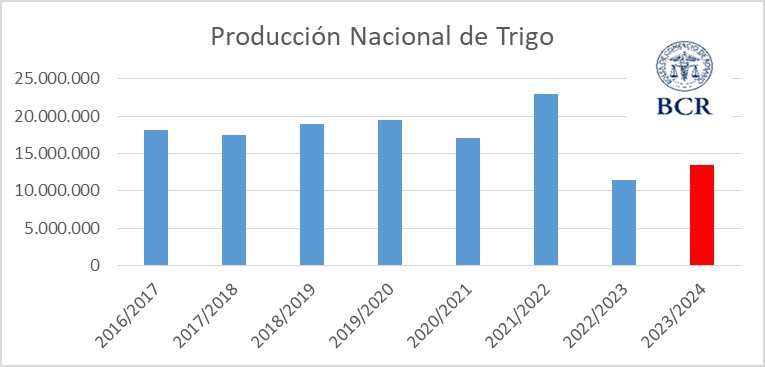 A pesar de que se ajustó la estimación de área sembrada (en Córdoba) en 100.000 ha, los rindes fueron golpeados. La sequía que siguió vigente en gran parte de las zonas productivas de Argentina hasta el 20 de octubre, el efecto de las heladas tardías y los posibles efectos de enfermedades fúngicas tras las lluvias mantienen un alto nivel de incertidumbre sobre el resultado de la actual campaña. A pesar de que se hizo todo para que el potencial triguero supere los 17 Mt, guarismo que se hubiese alcanzado bajo un escenario de clima normal, la continuidad de condiciones de sequía, que se prolongó por casi 3 años y 10 meses, no permitió la recuperación del trigo. Por lo tanto, la estimación de noviembre refleja la posibilidad de obtener 13,5 Mt. El guarismo tiene en cuenta una superficie sembrada de 5,5 M ha y una pérdida de superficie de 390.000 ha.