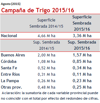 Los guarismos de superficie del trigo 2015/2016 seguirán revisándose mensualmente, hasta llegar a la configuración final. En el presente informe se estima un área total de 3,36 millones de hectáreas, lo cual es un 28% menor a los 4,6 millones de hectáreas cultivadas en la campaña anterior.