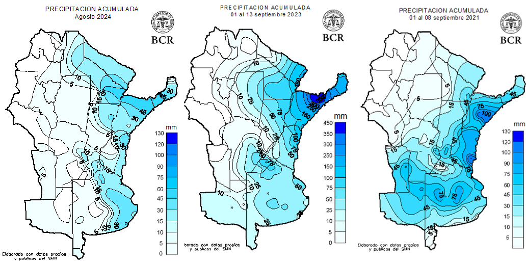 Hace un mes se proyectaba un potencial de producción de trigo en torno a 20,5 millones de toneladas, partiendo de un área sembrada de 6,7 M de ha. Pero hay que tener en cuenta que en el mes de setiembre no ha habido lluvias importantes y ya hay un 30% del trigo en condiciones regulares a malas. Estuvo la posibilidad de sumar algunos milímetros en la región centro en las últimas 24 horas, pero no sucedió. Solo una parte del SE bonaerense recibió entre 4 y 12 mm, con un máximo registrado en Coronel Suárez de 18 mm. En oposición, en el año pasado, setiembre ayudaba a sostener al cultivo tras la brutal sequía del verano. En 2021, la campaña que terminó con un récord de producción de 23 Mt, tuvo una primera quincena de setiembre que perfilaba con un muy buen escenario para el cultivo. Sin lluvias importantes para mostrar, más allá de lo sucedido el martes, se exhiben en los siguientes mapas las últimas precipitaciones significativas, las que ocurrieron en agosto 2024 versus las de la primera quincena de septiembre de 2021 y 2023.