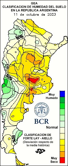 La sostenida sequía le ha quitado al trigo las posibilidades de alcanzar siquiera los 15,6 M de Tn que se proyectaban como escenario de normalidad al comienzo de la campaña. Setiembre y los primeros 11 días de octubre mantienen la predominancia de la circulación fría y seca que no permite el cambio del patrón seco que domina en gran parte de la región pampeana. Se estima que casi 2,5 M de ha trigo —el 46% del trigo sembrado— está en condiciones regulares a malas. El área que quedaría sin llegar a cosecha estaría en el orden de las 340.000 ha.