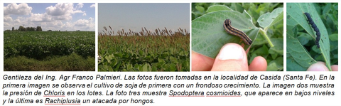 Las lluvias de la semana en América (noroeste de Buenos Aires) rondaron los 17 mm. 'No hay problemas de anegamiento, la oferta hídrica es muy justa, incluso algunos lotes comienzan a mostrar síntomas de estrés' reportan preocupados los ingenieros e la zona. El maíz de primera se encuentra en grano lechoso en un 95% y el remanente restante está en floración. La condición se califica como buena y muy buena en el 80% de los cuadros. Un 15% esta en regulares condiciones. 'Vemos poca presencia de roya y más incidencia de bacteriosis' observan. El maíz tardío está muy bueno en el 60% del área, el resto se reparte entre excelente y bueno. Los estadios van de V6 a V10 (sexta y décima hoja expandida). Hay leve presencia de cogollero. En cuanto a soja de primera, los cuadros se concentran en plena fructificación (50%) e inicios de la misma (40%), pero también hay lotes aún en plena floración. 'Consideramos regulares al 10% del área debido a la interacción ambiente por deficiencia hídrica' analizan los expertos. Sin embargo, el grueso se considera buena (30%), muy bueno (40%) y excelente (20%). 'Los mejores lotes poseen influencia de napas' aclaran. La soja de segunda esta en muy buen estado en el 70% del área y en excelente estado en el 20%. Cursa los estadios vegetativos de V3 a V5. 'Comienzan eclosiones de isoca medidora' advierten los técnicos. Que junto con chinches, están teniendo una moderada presión en el lote. 'La enfermedad foliar Cercospora kikuchii avanza en las sojas de primera y de segunda definiendo la mayoría de los controles' concluyen los especialistas.