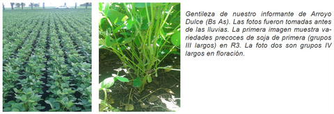 En la zona de Arroyo Dulce llovió 25 y 50 mm. 'En nuestra zona los caminos están razonablemente bien, pudiendo transitar sin problemas dos días después de las lluvias' comentan los técnicos. Sin embargo, notan excesos en lotes bajos contiguos a cañadas. 'Particularmente, hay un lote que se trilló en agosto 2014 el maíz de segunda con 10/20 cm de agua en superficie. Teníamos esperanzas que para enero bajaran las napas, dando oportunidad de alguna soja tardía. Hoy estamos igual o peor' comentan desanimados. De todas formas, consideran que este tipo de lotes son de escasa incidencia y no afectan los promedios zonales. 'Maíz de primera casi no hay en la zona...' observan. Los pocos lotes sembrados llenan sus granos. En tanto, los de segunda expanden su sexta a octava hoja con buenas a muy buenas condiciones. 'Todavía no demuestra falta de nitrógeno, a pesar del lavado de nutrientes. Sin dudas más adelante, se recurrirá a nitrógeno líquido' aclaran los expertos. Los lotes de soja, en general están todos buenos, con enorme mayoría muy buenos (50%) y un 20% excelentes. 'No obstante las sucesivas tormentas han castigado superficie foliar. No están tan lindas como sería esperable dada cantidad de lluvia recibida' lamentan. El cultivo se encuentra en un 90% en plena floración y un 10% inicia la formación de vainas. Hay leve incidencia de enfermedades como Cercospora kikuchii, bacteriosis y MOR. La oleaginosa de segunda se encuentra iniciando la floración y en plena floración en un 70% del área, el resto sigue expandiendo hojas. Se considera excelente en un 25% del área, muy buena en un 40% y buena en un 30%.