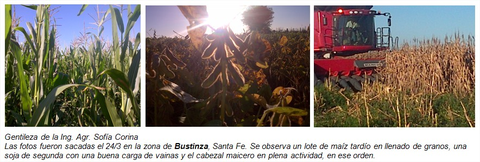 En Bustinza, el cielo despejado y la baja humedad relativa favorecieron las labores de recolección y embolsado del grano. El maíz de primera arrojó un rinde promedio de 70 qq/ha, con una variación de 65 y 85 quintales. Rindes magros pero buena calidad de grano y humedad ideal: 14%. 'Hubo muchas plantas sin espigas' observan los maquinistas. La soja de primera obtiene un rinde promedio de 36 qq/ha. 'Nos sorprende los ciclos cortos que están arrojando buenos rindes' precisan los técnicos. En la zona se mencionan cifras que van desde los 30 a 45 qq/ha. Es importante destacar que estos lotes fueron los primeros en sembrarse y sufrieron mucho la sequía y el ataque de bolillera de enero. La calidad de grano es buena, aunque se observa una merma en el peso de mil. 'Hay lotes todavía con grano húmedo que deben esperar'. La oleaginosa de segunda está finalizando su ciclo. 'Observamos una buena carga de vainas'. El oscurecimiento de la vaina en el lado superior es un síntoma de bajas temperaturas. Los rindes que se esperan van de 30 a 35 qq/ha. El maíz tardío, si bien se ven muy bueno, están teniendo problemas con tizón foliar (Helminthosporium turcicum).