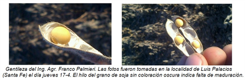 Con una recolección en Arroyo Dulce que ronda el 70% de la superficie destinada a soja de primera, el grano obtenido está muy seco. Presenta un 12% de humedad. 'Nuestro equipo de trilla además de lotes propios trabaja lotes de terceros (incluso semilleros) en toda la zona, por ende, hemos trillado casi todas las variedades y fechas de siembra. Hasta el momento el rinde promedio que indica el monitor de la cosechadora es de 2918 kg de soja...para nuestra zona es una calamidad o está muy cerca de ello' es el testimonio de los técnicos que recorren el área. Se diagnostica que los rindes cayeron entre 5 y 6qq/ha debido al 'lavado' de granos provocado por los recientes acumulados de 250 mm. Fundamentalmente, este efecto se magnifica en aquellos cuadros que se encontraban en madurez comercial previamente a las lluvias. En aquellas plantas donde persistían las hojas pudieron sobrellevar mejor este inconveniente y en esos lotes las pérdidas serían menores. 'Pero, en ese caso, no hay metodología disponible para constatar estas mermas' especifican los técnicos. Respecto a la oleaginosa de segunda, sólo se trilló un lote implantando sobre legumbres, no sobre trigo. 'Pintaba como el mejor y rindió 34 qq/ha'. Al igual que en otras zonas, el maíz sigue relegado para dar prioridad a la recolección de la soja. Aún quedan lotes por trillar, estiman que espera un 30% del cereal en pie. El maíz de segunda culminó el llenado de granos, afortunadamente antes de las primeras heladas. Hay evidencias de estrés en floración. Aún así, en general están buenos y las bases de rendimiento se fijarían en 80-85 qq/ha. Las intenciones de siembra para el cereal de invierno indican un aumento en superficie entre 10 a 15% como máximo.
