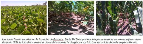 'Las condiciones en general para el cultivo de soja son excelentes, muy distinto a otros años' comentan entusiasmados los técnicos de Carlos Pellegrini. El 80% del área de soja de primera se encuentra en plena floración (R2) y el 20% ingresa en la formación de vainas. La soja de segunda inicia su floración en muy buenas condiciones. Hasta el momento no hubo grandes problemas con insectos, solo detectaron un incipiente ataque de una generación bolillera y otro de medidora que ya cumplió su ciclo. Por ahora, la situación está controlada. 'A pesar de la alta humedad consecuencia de las repetidas lluvias, las enfermedades de fin de ciclo no avanzan. De todas maneras, la temperatura no es la óptima para que se dispare el hongo y produzca alguna epifitia importante' explican los expertos. Lo mismo se repite para el caso del maíz. 'El cereal no ha sufrido los avatares del clima que normalmente suceden en esta época y se encuentra madurando sus granos, sin inconvenientes'. Con muy buenas calificaciones, la estimación a cosecha del maíz temprano ronda los 120 qq/ha, siendo 100 qq/ha el rinde de la zona. El maíz tardío está completamente sembrado y se encuentra expandiendo sus hojas. Las reservas hídricas son óptimas para continuar con el desarrollo de los cultivos estivales.