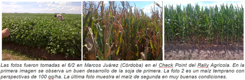 En otras zonas de las cercanías a Bombal, el último fin de semana llovió 14 mm. 'Más que suficiente, casi excesivo' expresan los técnicos. 'La soja de primera se encuentra extraordinariamente bien y las enfermedades son las esperadas con tanta humedad y forestación' analizan. 'Los hongos que se los combate convenientemente para no perder excesivos quintales en la producción' advierten. La soja de segunda está en buen estado. Por su parte, el maíz de segunda presenta muy buena condición y no fue afectado por el calor. Posee entre 10-12 hojas, empezando a largar las panojas.