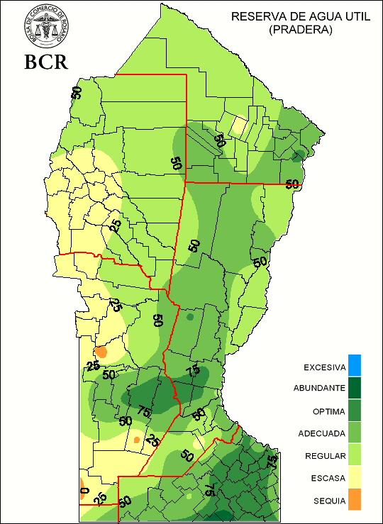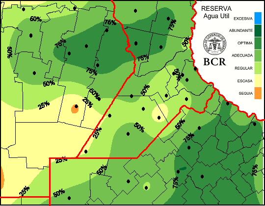 Con este panorama, las características de humedad del suelo se presentan muy buenas en la mayor parte de la región. Las condiciones de humedad sobre el norte de Buenos Aires, centro de Santa Fe y este de Córdoba se presentan óptimas, mientras que el resto de la región presenta condiciones adecuadas. Sólo una pequeña porción del sur de Córdoba se mantiene con reservas escasas, incluso con zonas que conservan características de sequía.
