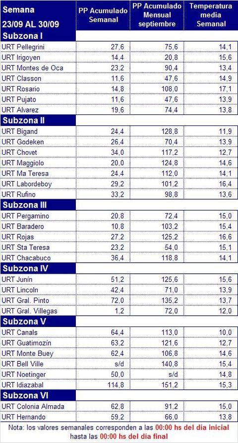 La semana comprendida entre el jueves 30 de septiembre y el miércoles 6 de octubre comenzará con un importante descenso de temperatura en gran parte de la región, con la posibilidad de que se registren, de manera aislada, algunas heladas débiles y especialmente concentradas en zonas bajas. En cuanto a las precipitaciones la semana se presentará con un solo período de inestabilidad durante el viernes, con la posibilidad de precipitaciones en forma aislada sobre gran parte de la región GEA. El resto de la semana se mantendrá con condiciones más estables, sin precipitaciones significativas. Los registros térmicos, serán bajos durante el jueves y viernes, luego, irán en ascenso, con valores mínimos que serán superiores a los 0 °C, y máximas que comenzarán siendo de alrededor de los 20 °C a principios de la semana, e irán incrementándose hasta el final de este período, alcanzando valores cercanos a los 25 °C. En cuanto a la circulación del viento, será muy variable a lo largo de la semana, comenzando con circulación del sector Sur con moderada intensidad, luego el viento rotará al sector Este perdiendo fuerza y finalmente se establecerá del sector Norte, manteniéndose de esa dirección hasta el final del período con leve a moderada intensidad. Esta rotación al sector Norte, provocará no solo el incremento de los registros térmicos sino también un importante aumento del contenido de humedad en las capas bajas de la atmósfera. Estas características serán beneficiosas en el comienzo de la próxima semana, ya que se presentarán buenas condiciones de humedad y temperaturas relativamente altas.