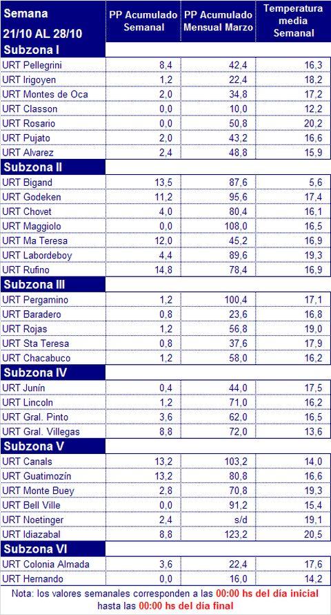 La semana comprendida entre el jueves 28 de octubre y el miércoles 3 de noviembre comenzará con condiciones inestables en el Sur de la zona GEA. La presencia de una masa de aire cálido y húmedo sobre la zona central del país combinado con el avance de una perturbación de niveles medios y altos de la atmósfera que avanza sobre la zona de Cuyo, generará el desarrollo de algunas precipitaciones en forma de chaparrones y tormentas a partir de la tarde del jueves, especialmente en el Oeste de la franja central del país, que se irán desplazando hacia el Este, afectando a la zona GEA en especial durante el viernes 29. Las precipitaciones esperadas serán en forma de chaparrones y tormentas, con acumulados importantes en gran parte de GEA. El sábado, las condiciones mejorarán rápidamente, aunque todavía pueden registrarse algunos chaparrones débiles y en forma aislada. A partir del domingo, la masa de aire cálido y húmedo se retirará hacia el noreste del país, permitiendo el ingreso de una masa de aire fresco y más seco a la zona de GEA, con lo que se prevé que las condiciones mejoren en toda la región con un moderado descenso de los registros térmicos, de todas maneras, las temperaturas mínimas rondarán los 10°C, salvo algunas zonas puntuales en los que la temperatura mínima puede llegar a los 5°C. En tanto, los valores máximos estarán alrededor de los 25°C durante gran parte de la semana, con picos que en forma aislada pueden alcanzar los 30°C. En cuanto a la circulación del viento, se prevé que la semana comience con vientos prevalecientes del sector Norte, con una rotación al sector Sur, durante el viernes, dirección que se mantendrá hasta el principio de la próxima semana, momento en el cual, rotará al sector Este. La intensidad del viento, se mantendrá entre moderada y regular, especialmente en la provincia de Córdoba durante el jueves y parte del viernes, luego disminuirá a leve y se mantendrá así a lo largo de todo el período.