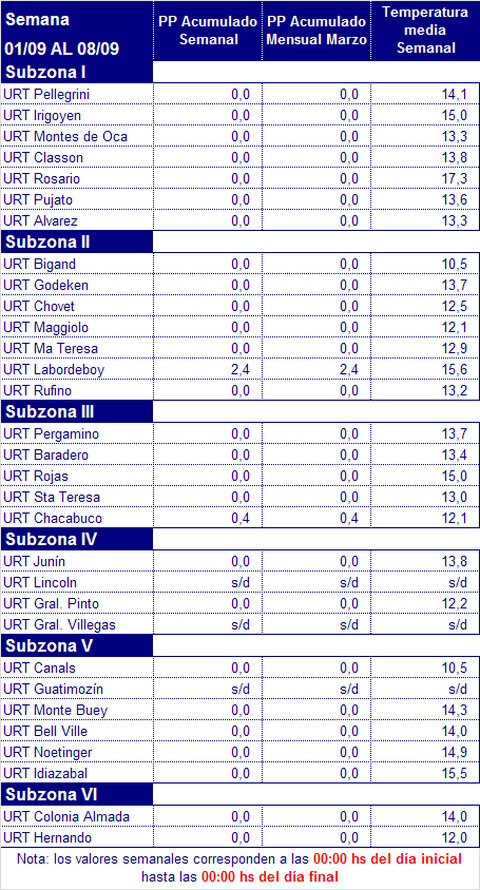 La semana comprendida entre el jueves 08 y el miércoles 14 de septiembre comenzará con la presencia de un centro de alta presión sobre la región que se irá desplazando hacia el Este por el avance de un sistema frontal frío. Justamente por este movimiento el viento se mantendrá del sector Norte, por lo que se espera que se mantenga el incremento de la temperatura en toda la región GEA. Al mismo tiempo, esta importante circulación del sector Norte también traerá aparejado un significativo aumento en el contenido de humedad en las capas bajas de la atmósfera. A partir del sábado en horas de la tarde, se prevé el avance de un sistema frontal frío desde el centro de la región pampeana hacia el área de cobertura, pero no se espera que se desarrollen precipitaciones sobre GEA. De todas maneras, habrá una rotación del viento al sector sur, con algunas ráfagas y un descenso moderado de temperatura. Este descenso térmico será de corta duración y rápidamente las marcas se recuperarán, volviendo a registrarse valores similares a los del final del período anterior. En cuanto a la humedad en las capas bajas de la atmósfera, se espera que a lo largo de la semana vaya aumentando en la zona central del país, particularmente en la región GEA, con un leve descenso durante el fin de semana, debido al pasaje del frente frío sobre la franja central del país, pero luego, nuevamente se irá incrementando a lo largo del resto de la semana.