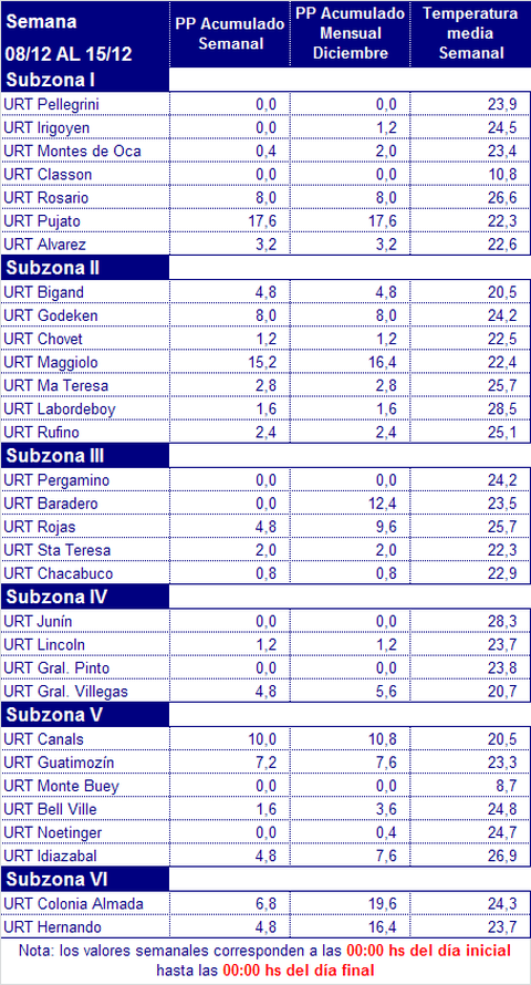 La semana comprendida entre el jueves 15 y el miércoles 21 de diciembre comienza con la presencia de un centro de alta presión ubicado sobre el sudeste de la provincia de Buenos Aires, combinado con un centro de baja presión sobre las costas del Sur de Uruguay, provocando condiciones de inestabilidad en toda la franja este de la provincia de Buenos Aires. La posición de este anticiclón, generará una circulación de viento prevaleciente del sector Sur durante los primeros días del período. El centro de baja presión se irá desplazando hacia el Este, permitiendo el ingreso a la región GEA del sistema anticiclónico provocando que durante el viernes, sábado y domingo se mantengan condiciones estables en toda la franja central del país. A partir del lunes, una perturbación de niveles medios de la atmósfera que avanzará desde el Oeste hacia la zona GEA sumado a un sistema frontal frío que avanzará desde la zona norte de la región patagónica, irá generando condiciones de tiempo inestable. Esta asociación entre el sistema frontal y la perturbación de niveles medios, producirá precipitaciones en forma de chaparrones y tormentas de variada intensidad, afectando principalmente a la provincia de Córdoba durante el martes, pero luego se irán intensificando y generalizando a toda la región. Previo a la llegada del frente frío, se prevé un significativo aumento de las marcas térmicas, que será lo más relevante del período de pronóstico, ya que las máximas previstas podrían alcanzar valores superiores a lo 35 o 37°C con las temperaturas más elevadas sobre la provincia de Córdoba. En cuanto a la circulación del viento, se espera que comience prevaleciendo del sector sur, pero rotando rápidamente hacia el norte y luego al noroeste, lo que favorecerá el significativo aumento de las marcas térmicas y el incremento del contenido de humedad en las capas bajas de la atmósfera. Por este motivo, no se descarta que las precipitaciones previstas para el martes y miércoles sobre GEA, sean de fuerte intensidad.