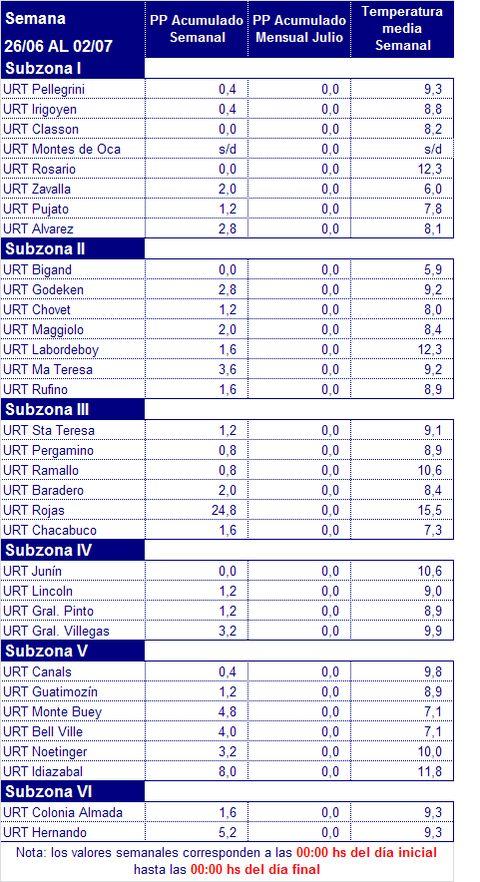 La semana comprendida entre el jueves 3 y el miércoles 9 de julio comenzará con el avance de una perturbación de niveles medios sobre la región central del país, que generará lluvias y tormentas de variada intensidad. Fundamentalmente el sábado y domingo, momento en el cual se prevé que se desarrollen los fenómenos más intensos. Esta perturbación de niveles medios se verá reflejada en superficie por la presencia de un sistema frontal frío que se desplazará desde el sudoeste hacia el noreste del país. Previo a la llegada del frente, el viento prevalecerá del sector norte, con moderada intensidad, favoreciendo el ascenso de las marcas térmicas y el aumento de humedad en las capas bajas de la atmósfera, generando una mayor inestabilidad en toda la región GEA. La combinación de estas condiciones con la llegada del sistema frontal será la responsable de las importantes precipitaciones previstas para el fin de semana. Una vez que el sistema frontal avance por la zona central del país, se prevé una rotación del viento al sector sur y el ingreso de una masa de aire frío y seco, que permitirá el descenso de las marcas térmicas en toda la zona GEA. Esta disminución de las marcas térmicas será muy significativa, por lo que no se descartan heladas en la región durante el lunes o martes. Luego, los valores de temperatura presentarán un ascenso leve hasta el final del período de pronóstico. Respecto a la humedad en las capas bajas de la atmósfera, se observará un aumento durante los primeros días de pronóstico, debido a la intensa circulación del viento del sector norte, y luego del pasaje del sistema frontal una significativa disminución que acompañará el descenso térmico.