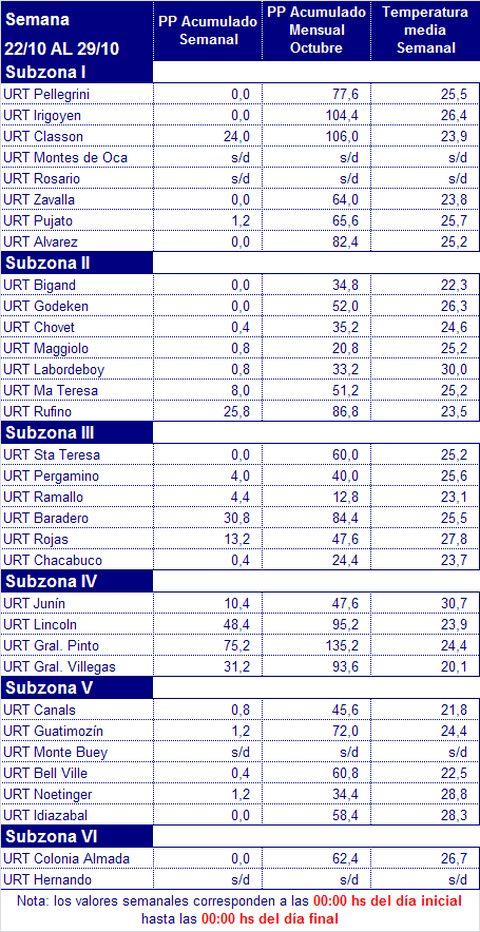 La semana comprendida entre el jueves 30 de octubre y el miércoles 5 de noviembre comienza con condiciones de tiempo estable. Posteriormente a las fuertes precipitaciones observadas sobre la provincia de Buenos Aires, ingresa un centro de alta presión a la región central del país que provoca la estabilización de las condiciones y una disminución del contenido de humedad en las capas bajas de la atmósfera junto a un importante descenso de las marcas térmicas, con una rotación del viento al sector sur, que favorece a acentuar estas condiciones. Incluso se prevé que las marcas térmicas mínimas durante el fin de semana sean cercanas a los 3 o 4ºC en algunos sectores de GEA. Pero la estabilidad durará poco en el área central del país, ya que a partir del sábado, nuevamente con viento del sector norte comenzará el aporte humedad y temperaturas en ascenso, especialmente sobre la provincia de Córdoba, donde empezarán a presentarse condiciones de tiempo inestable, con incremento de la cobertura nubosa. Durante el domingo, las precipitaciones se desarrollaran especialmente sobre la provincia de Córdoba, pero con acumulados todavía insuficientes, en el orden de los 15/20mm. Al finalizar el fin de semana, y especialmente durante el martes, comenzará a desarrollarse un centro de baja presión sobre el sudeste de la provincia de Buenos Aires que permitirá nuevamente el desarrollo de lluvias y chaparrones, junto con algunas tormentas aisladas, especialmente sobre dicha provincia. Las condiciones seguirán inestables en la provincia de Buenos Aires hasta el final del período analizado. En cuanto a la circulación del viento se prevé que en el comienzo del período de pronóstico prevalezca del sector sur, con fuerte intensidad, pero a medida que transcurran los días a partir del fin de semana irá rotando al sector norte con una disminución de la intensidad. Hacia el último día de pronóstico, nuevamente se prevé que el viento rote al sector sur con incremento de la velocidad. La humedad en las capas de la atmósfera será escasa luego de las fuertes lluvias registradas pero, a medida que transcurran las jornadas y el viento comience a cambiar al sector norte, comenzará a aumentar de manera significativa hasta el final del período de pronóstico.