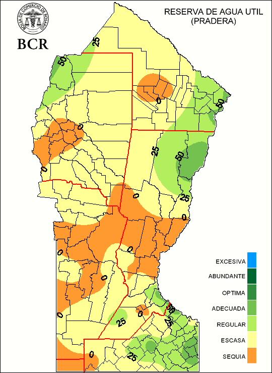 Con este panorama y haciendo el balance entre los elevados registros térmicos y las lluvias recibidas durante el periodo, se puede apreciar una importante mejora de las condiciones hídricas sobre gran parte de la región central del país. De todas maneras, todavía se observan sectores con un déficit hídrico muy importante, alcanzando hasta 60 a 80 mm especialmente sobre la franja norte y porción oeste de GEA. Estas características podrían pasar a ser óptimas, si en los próximos 15 días se alcanzan acumulados de 80 a 100 mm sobre la región.